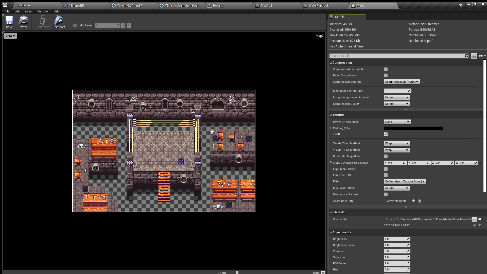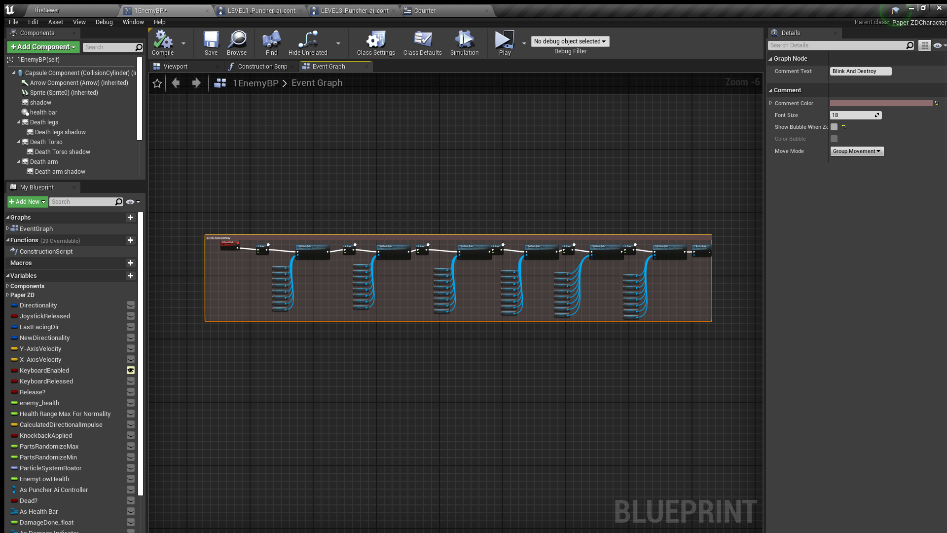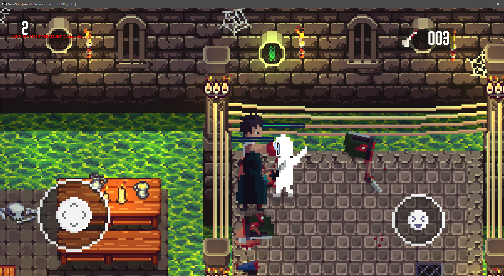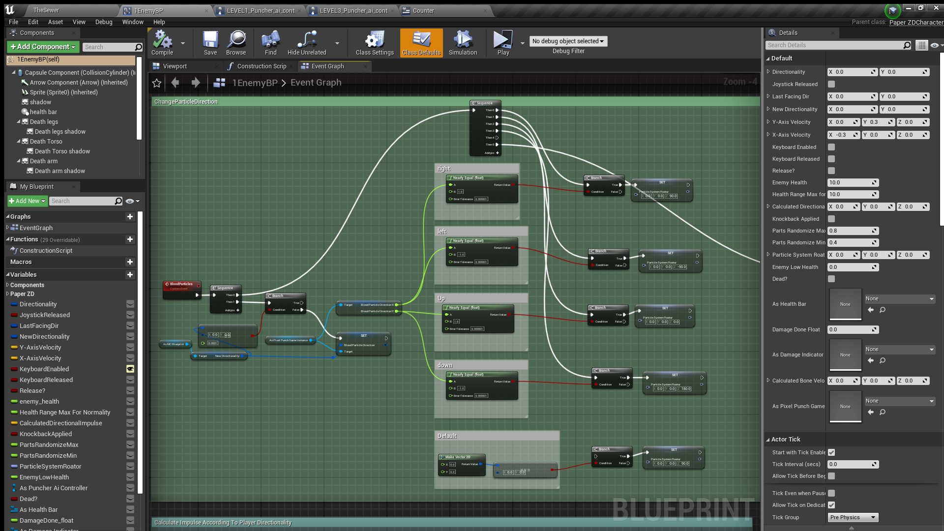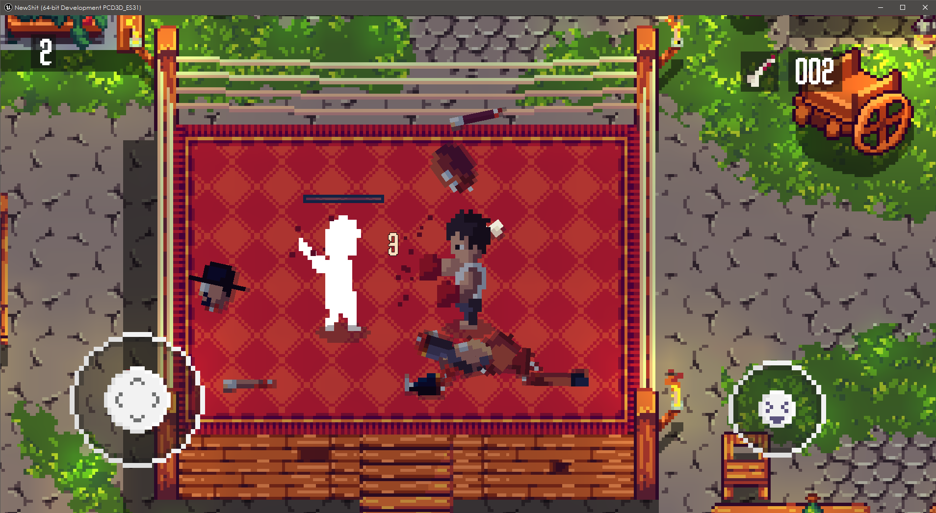 I created the character art myself, while I hired an artist for the background maps. My goal is to complete this project as soon as possible. Progress has been great, but the game is still under development. Artwork is currently the main obstacle to completion, but I'm confident I'll overcome it soon. As I made progress, I also delved into improving the "Game Feel." I implemented a custom body dismemberment system, a 2D blood particle system, dynamic health bars, damage pop-up widgets, and more.